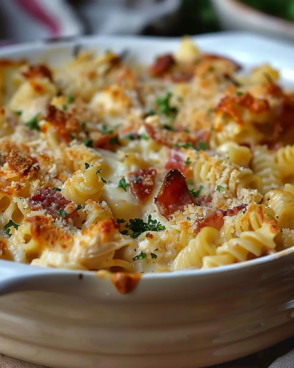 Enjoy this Crazy Good Chicken Pasta Casserole packed with turkey bacon and flavorful ingredients, perfect for family dinners and gatherings.