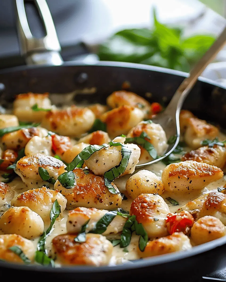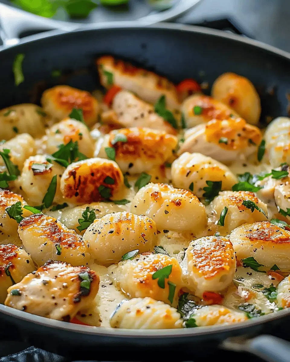 A delightful creamy garlic chicken gnocchi dish that combines comfort and flavor in one skillet.