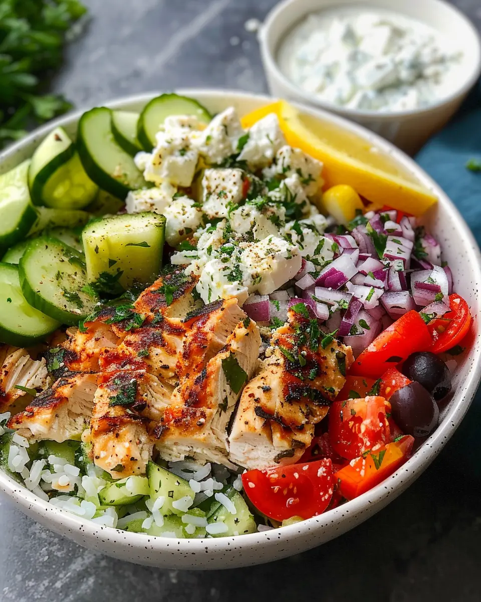 Enjoy a healthy and delicious Greek Chicken Bowl packed with flavors and fresh ingredients.