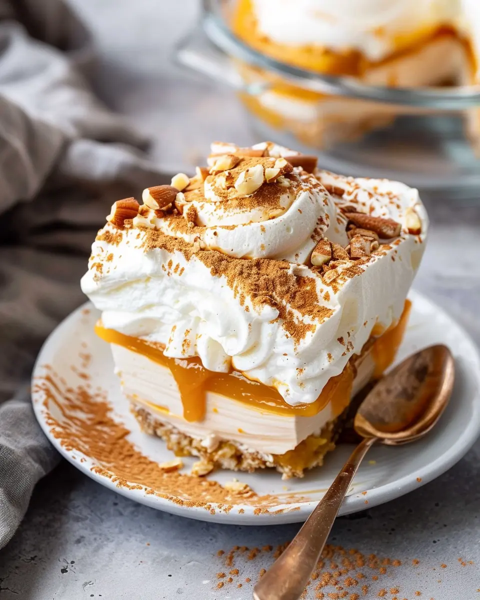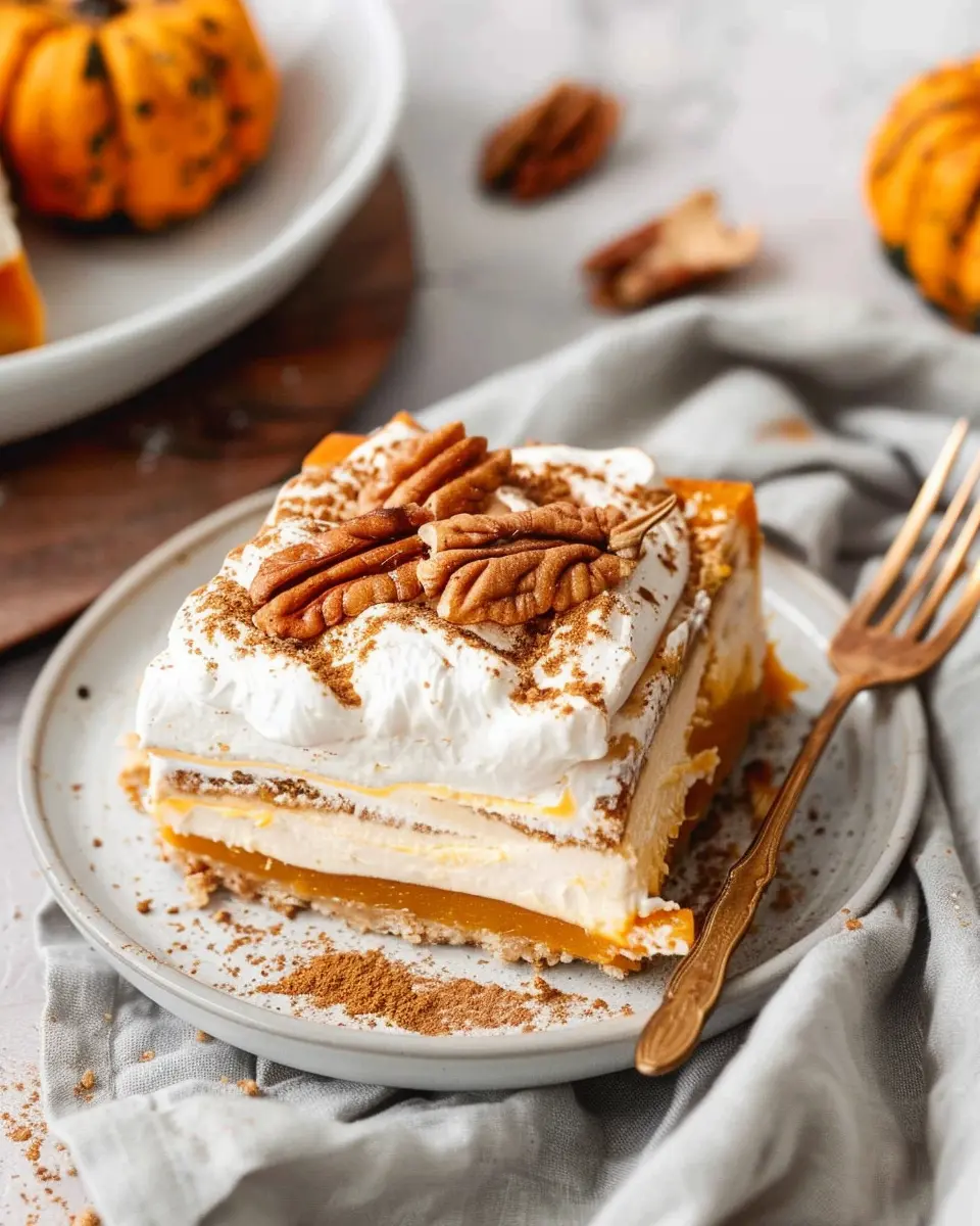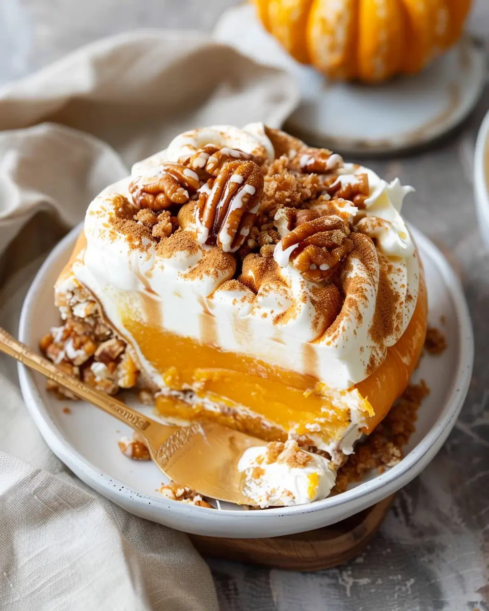 This Pumpkin Lush is a delightful fall dessert that combines creamy pumpkin flavors with a crunchy crust.