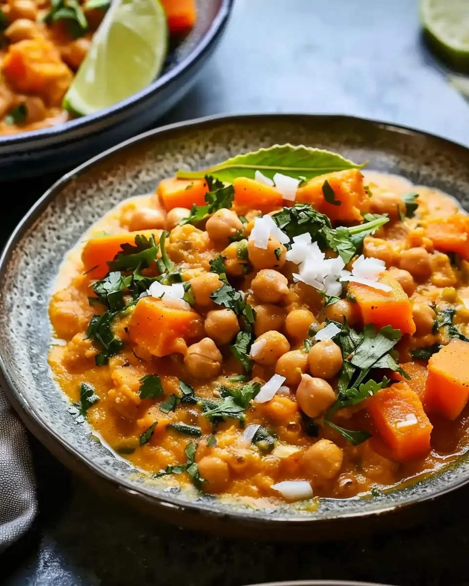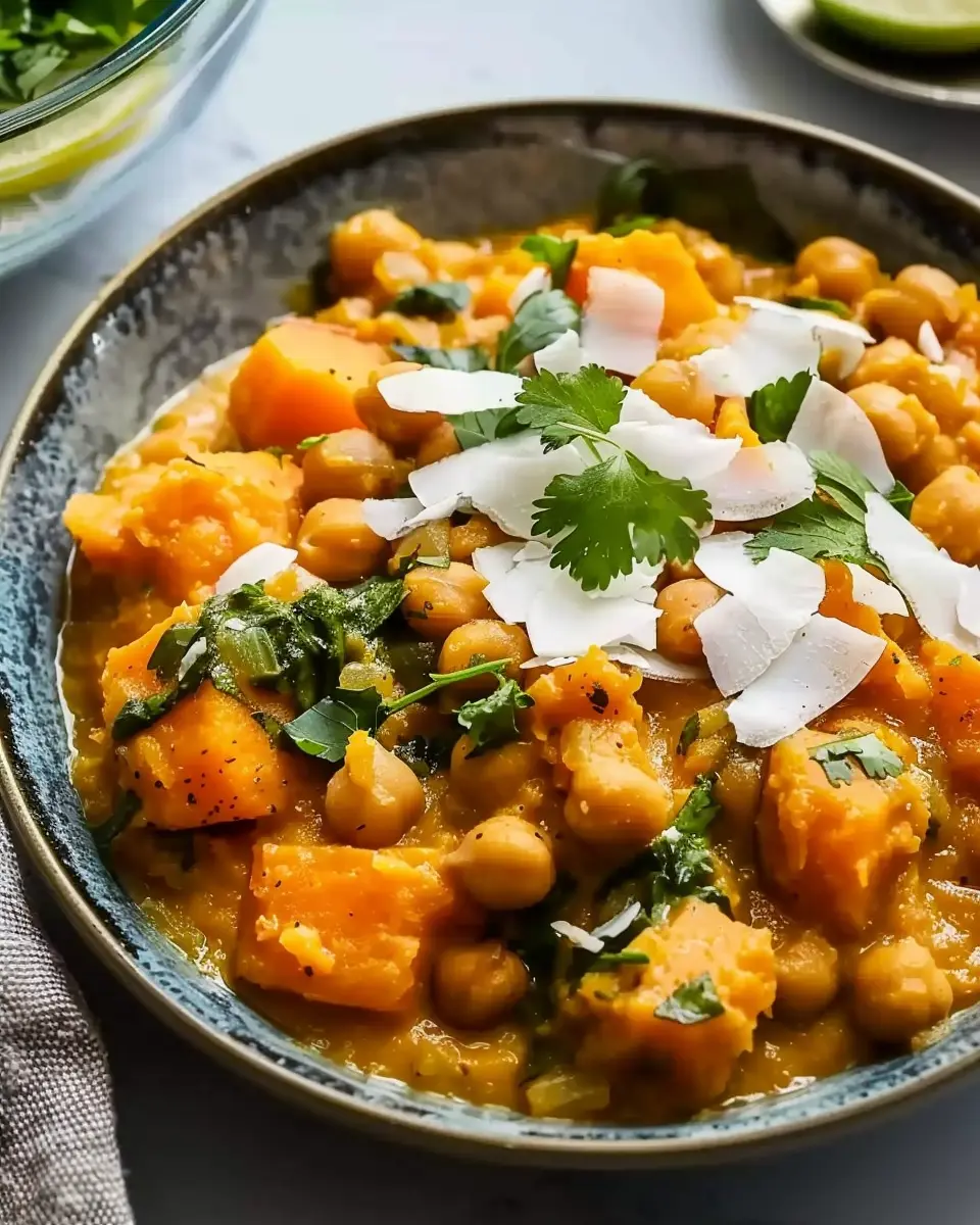 A delicious and nutritious slow cooker recipe featuring sweet potatoes, chickpeas, and coconut.