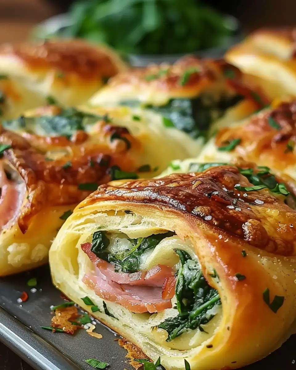 Delicious breakfast rolls filled with spinach, turkey bacon, and chicken ham, perfect for a hearty morning meal.