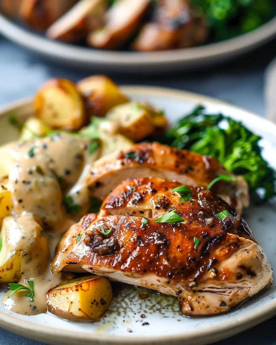 Once your chicken is cooked, slice it and plate it up with the mushroom sauce drizzled generously on top. Pair it with a side of roasted vegetables or a fresh salad to round out your vegan chicken dinner.